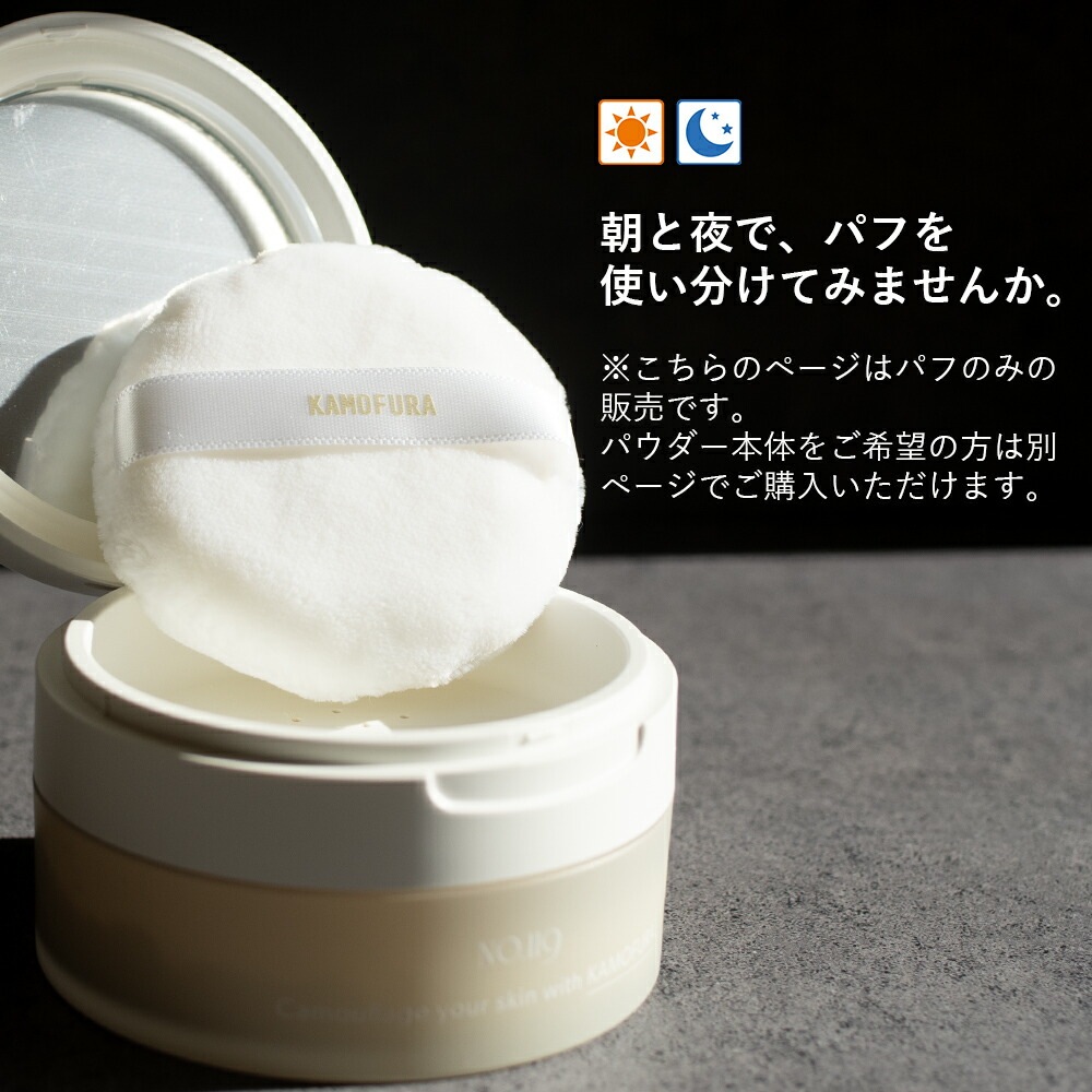 付属のパフにバウダーを取り、余分なパウダーを落としてから、すべらせるようにお別に伸ばしてください。パフはいつも清潔にしてお使いください。 |