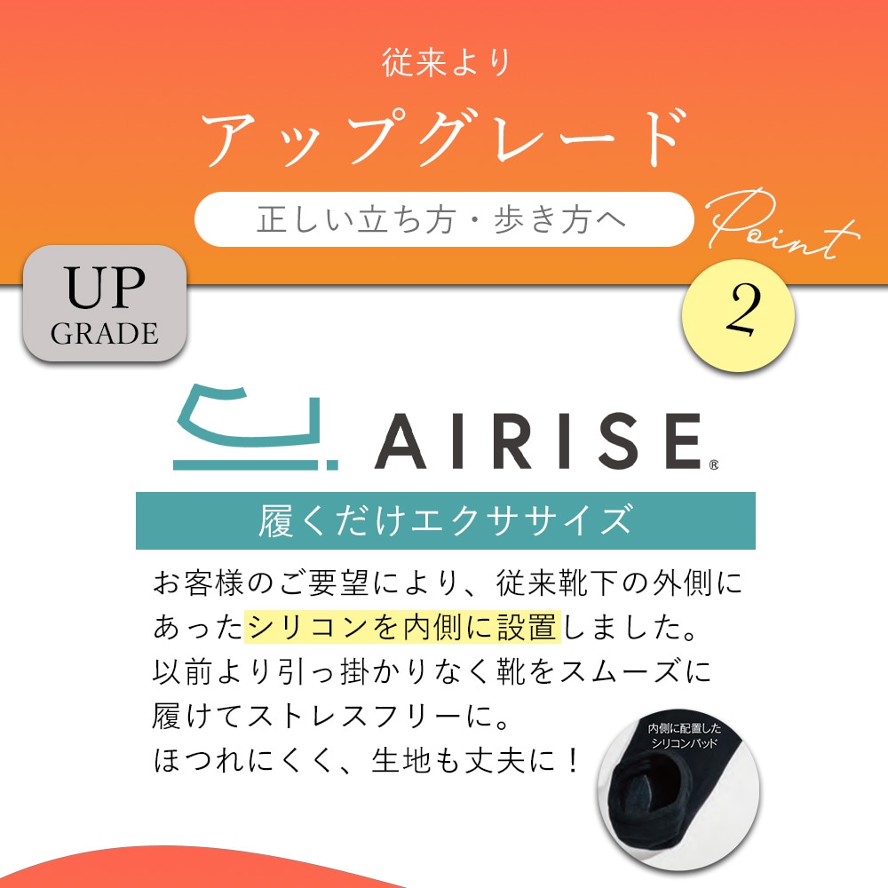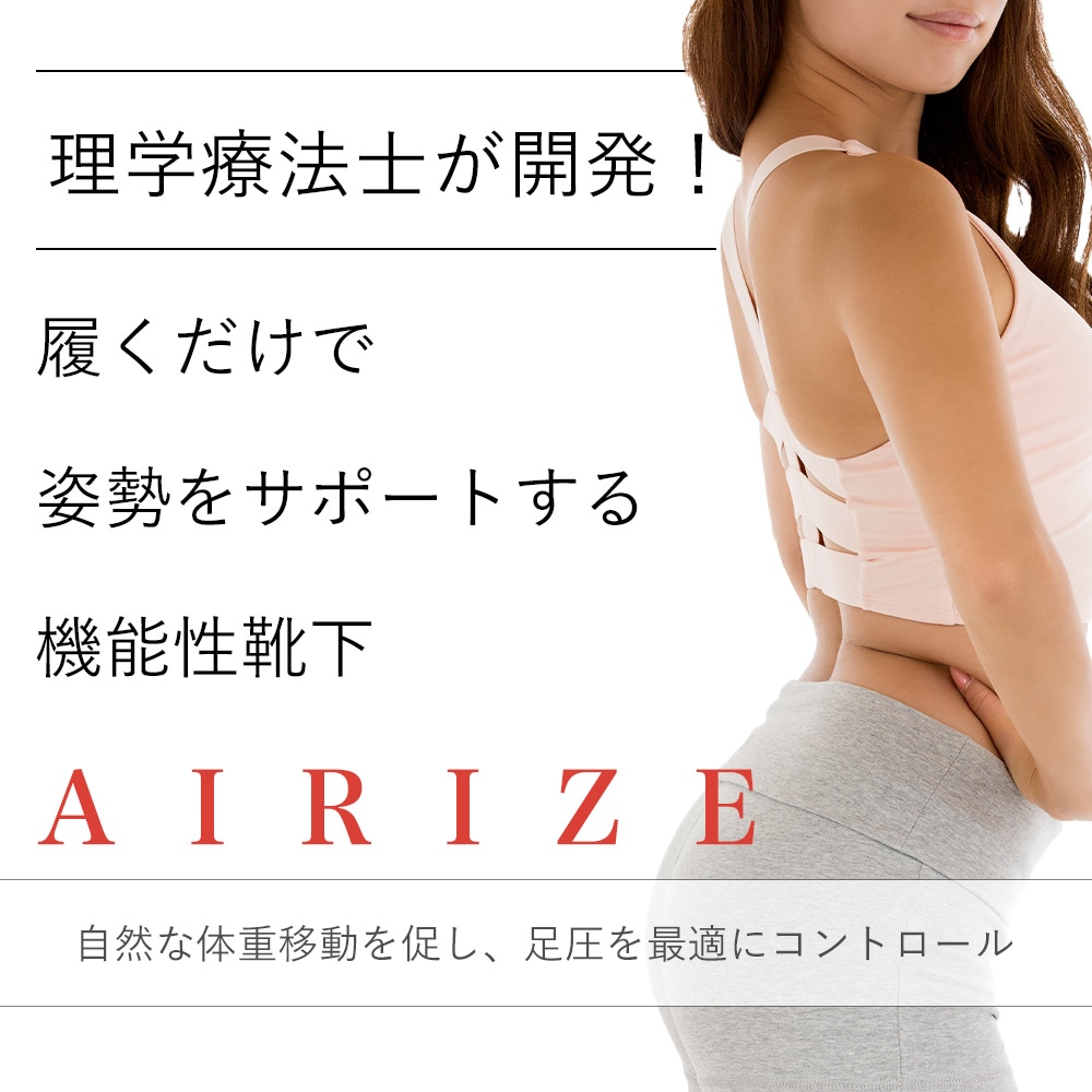 理学療法士が開発! 履くだけで姿勢をサポートする機能性靴下AIRIZE 自然な体重移動を促し、足圧を最適にコントロール 燃焼効率を高めた新しいエアライズ。 特殊可視光線(深褐色混合波)を採用し、電波パルスエネルギーが体に照射されることで、筋肉と反応し生体バランスを整えます。 BURNUP:深褐色混合派とは 特殊可視光領域に熱加工した素材により筋肉の収縮効率を最大化させる。 着るエクササイズマテリアルです。 さらに、お客様のご要望により、従来靴下の外側にあったシリコンを内側に設置しました。 以前より引っ掛かりなく靴をスムーズに履けてストレスフリーに。 特許取得の足裏の2つのパッドが、足裏のアーチの形状をサポート。 運動のパフォーマンスを支え、身体にかかる急激な負荷を軽減します。自然と動きやすい姿勢に導くキセキの靴下です。 AIRISEの機能 履くだけで正しい歩き方へ 3点支持で体重を支える事で重心が安定化! 特許取得の2つの足圧誘導シリコンにより体幹を安定させ、疲れにくい体へ 足裏に配置したシリコン製のAIRISE PADにより重心の3点支持を作り出し、体幹を安定化。 歩く際の足圧を自然に親指の方向へ誘導することで、スムーズな歩き方へ |