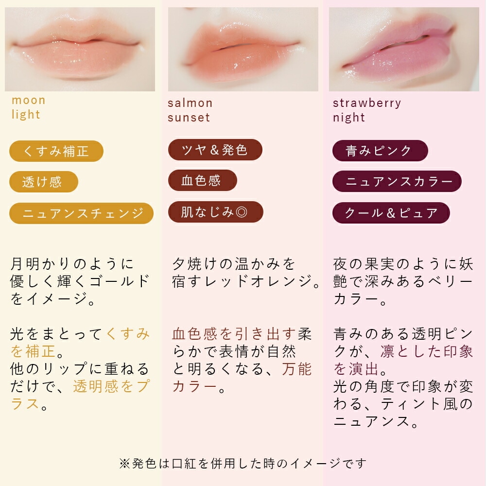 Moonlight (ムーンライト) ビスジグリセリルポリアシルアジペート-2、リンゴ酸ジイソステアリル、トリイソステアリン酸ポリグリセリル-2、(ヒマシ油/IPDI)コポリマー、ポリメチルシルセスキオキサン、1,2-ヘキサンジオール、トリエチルヘキサノイン、マイクロクリスタリンワックス、ジメチルシリル化シリカ、トリ(カプリル/カプリン酸)グリセリル、ポリヒドロキシステアリン酸、酢酸トコフェロール、ホウケイ酸(Ca/Al)、レシチン、酸化鉄、合成フルオロフロゴパイト、酸化チタン、パルミチン酸エチルヘキシル、イソステアリン酸、ミリスチン酸イソプロピル、ポリリシノレイン酸ポリグリセリル-3、酸化スズ Salmon Sunset (サーモンサンセット) ビスジグリセリルポリアシルアジペート-2、リンゴ酸ジイソステアリル、トリイソステアリン酸ポリグリセリル-2、(ヒマシ油/IPDI)コポリマー、ポリメチルシルセスキオキサン、1,2-ヘキサンジオール、トリエチルヘキサノイン、マイクロクリスタリンワックス、酸化チタン、ジメチルシリル化シリカ、トリ(カプリル/カプリン酸)グリセリル、ポリヒドロキシステアリン酸、酢酸トコフェロール、ホウケイ酸(Ca/Al)、レシチン、合成フルオロフロゴパイト、黄5、パルミチン酸エチルヘキシル、イソステアリン酸、ミリスチン酸イソプロピル、ポリリシノレイン酸ポリグリセリル-3、赤202、酸化鉄、青1、酸化スズ Strawberry Night (ストロベリーナイト) ビスジグリセリルポリアシルアジペート-2、リンゴ酸ジイソステアリル、トリイソステアリン酸ポリグリセリル-2、(ヒマシ油/IPDI)コポリマー、ポリメチルシルセスキオキサン、1,2-ヘキサンジオール、トリエチルヘキサノイン、マイクロクリスタリンワックス、ジメチルシリル化シリカ、トリ(カプリル/カプリン酸)グリセリル、ポリヒドロキシステアリン酸、酢酸トコフェロール、ホウケイ酸(Ca/Al)、酸化チタン、レシチン、合成フルオロフロゴパイト、パルミチン酸エチルヘキシル、イソステアリン酸、ミリスチン酸イソプロピル、ポリリシノレイン酸ポリグリセリル-3、赤202、青1、酸化鉄、酸化スズ |